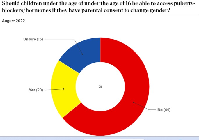 A Sunday Independent/Ireland Thinks poll in August 2022 found that the majority of Irish people polled (64%) are not in favour of children under the age of 16 being able to access puberty-blockers/hormones with parental consent, 16% were unsure only 20% were in favour.