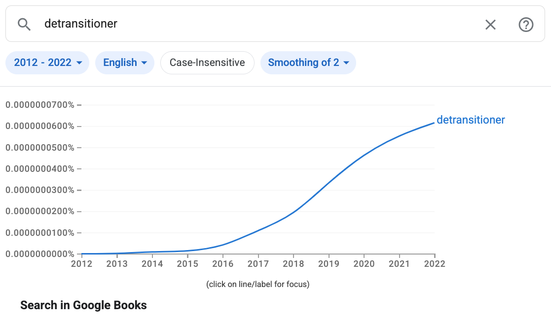 People who call themselves detransitioners are on the rise. Subreddit r/detrans was started in 2017 and has 56,000 members (the earliest reference we could find). An article by two gender clinicians makes reference to “the rising number of detransitioners.” Groups like Detrans Canada, GCCAN, and Detrans Voices wield it as an identity and rallying cry. Detransitioners increasingly have more resources available to them. The “Detransition” Wikipedia page was started in 2017 and the word “detransitioner” began to appear in edits sometime in 2018 or 2019.