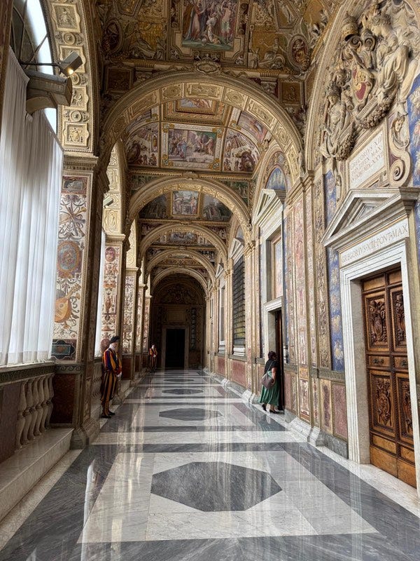 Entering the Vatican, we navigated several security checks, attended by the Swiss Guard. Although thorough, the process was surprisingly smooth, thanks to our official invitation for the private audience. With each step closer, we felt a deepening sense of occasion’s gravity. As we passed through grand corridors of the Vatican, flanked on either side by intricate frescoes, tapestries and timeless sculptures, we felt enthralled by the long tradition of devotion these masterpieces seemed to share.