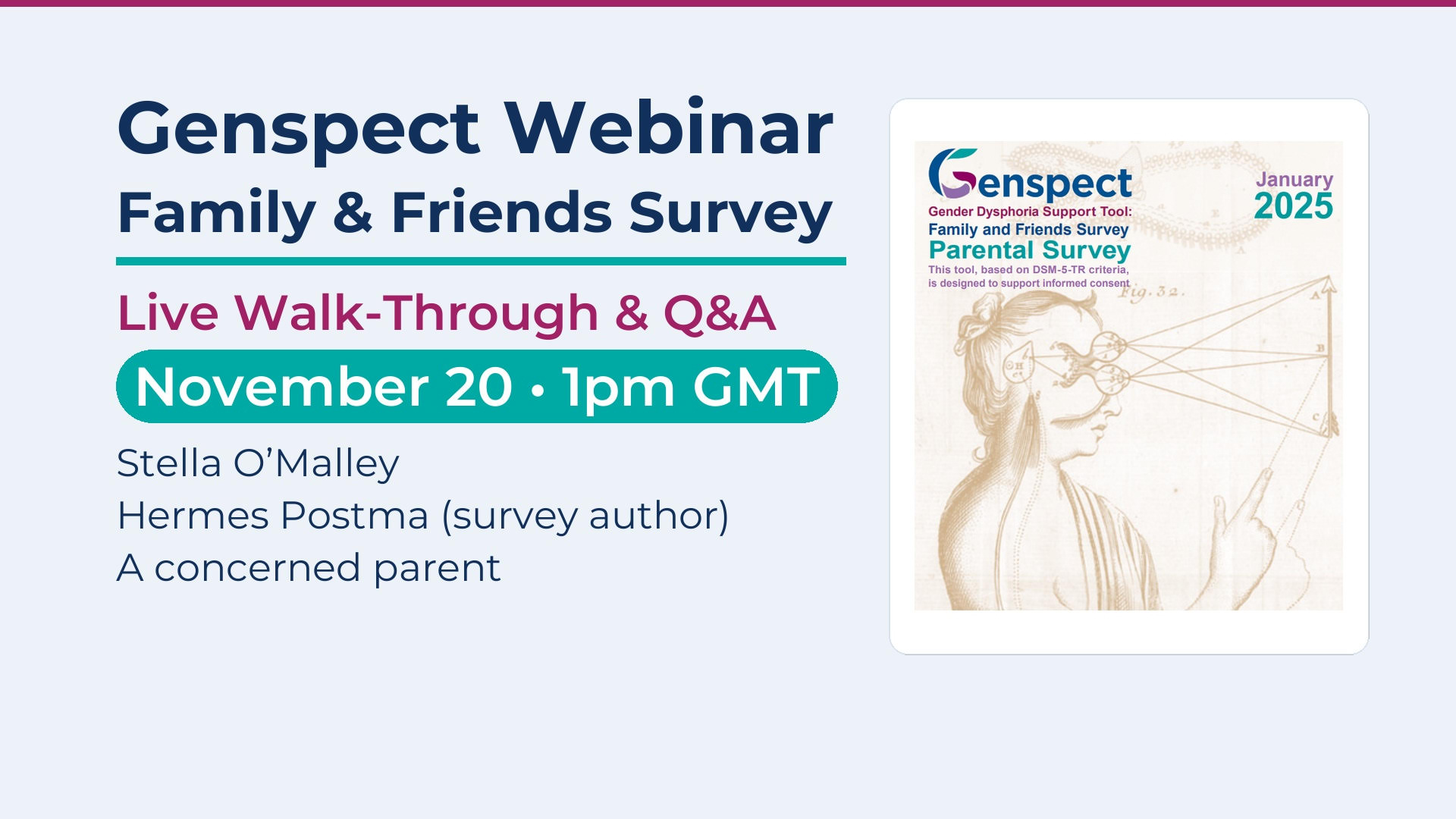 Genspect Family & Friends Survey Webinar Recorded November 20 at 1pm GMT This webinar, hosted by Stella O’Malley with...