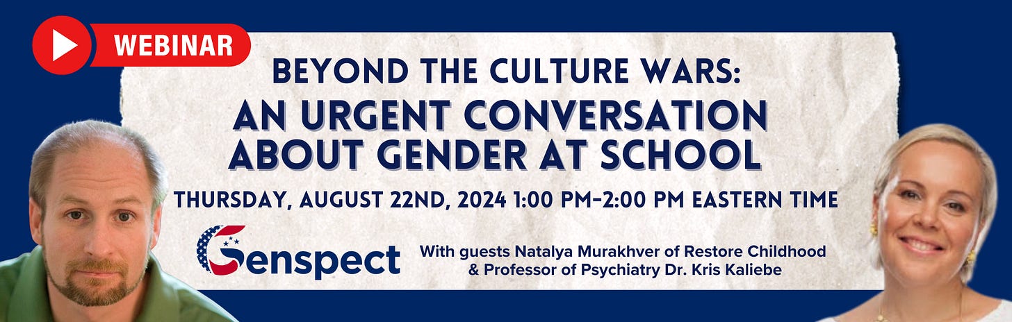 Join Natalya Murakhver and Dr. Kris Kaliebe Genspect USA webinar about An Urgent Conversation August 22nd at 1:00pm EST. Register here.