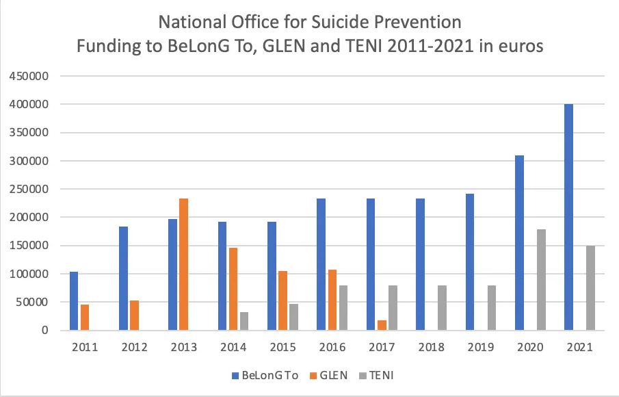 [Above: Figures from the NOSP show funding allocated to various LGBT groups between 2011 and 2021. Note that GLEN closed down in 2017 following allegations of financial mismanagement.]
