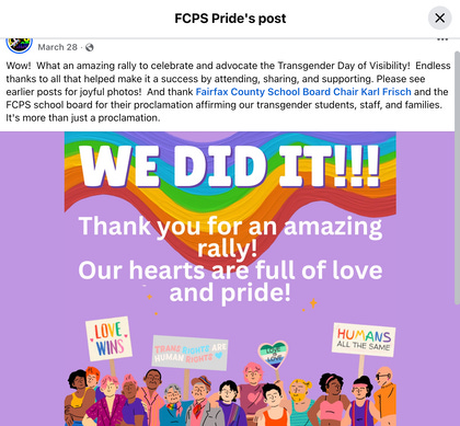 Schools, like those in Fairfax County, celebrate the Transgender Day of Visibility, but I wonder: Where are the voices of parents like me, or detransitioners who regret their choices? Why aren’t we hearing from psychologists who could help kids learn to love themselves as they are, instead of leaving their families, changing their names, pronouns, gender, and bodies to become someone they are not? Why are politicians so keen to promote transgenderism?