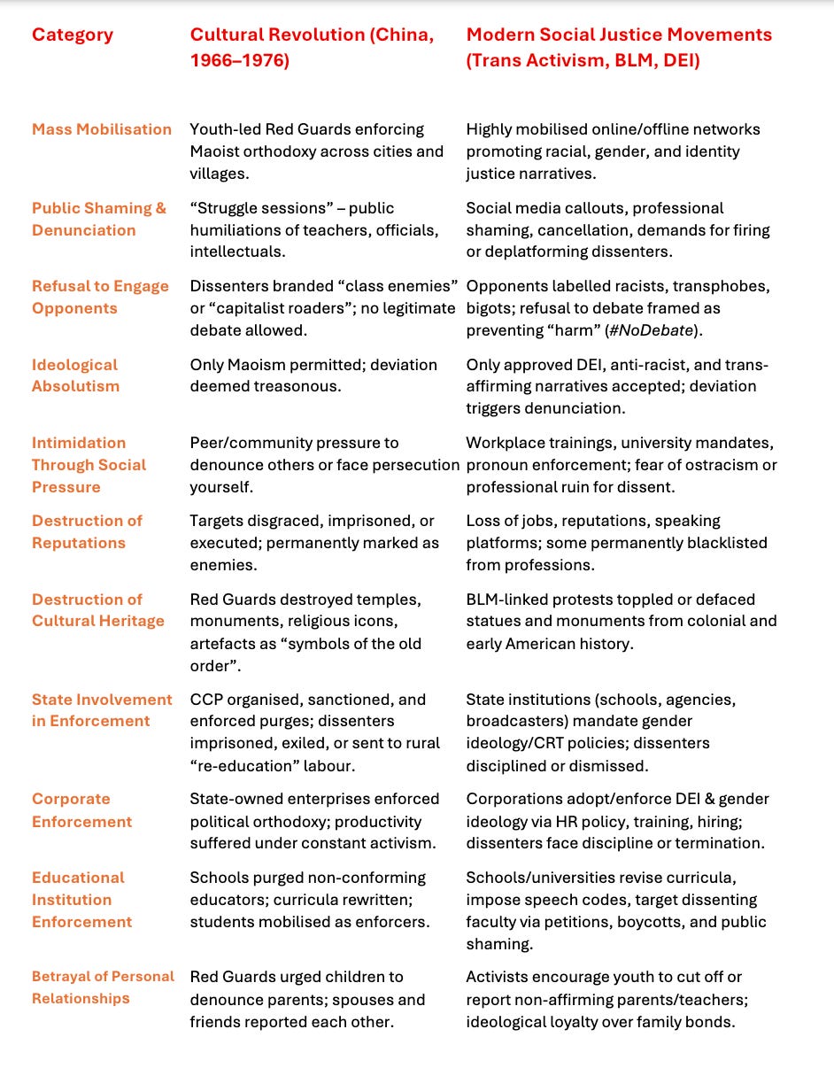 In Mao’s China, the rallying cry might have been “Down with the Four Olds”! Mao promised liberation from “old ideas, old culture, old customs, and old habits”. It was a catch-all insult for reactionaries. Today, the chants are “Transwomen are women” or “#NoDebate.” The substance is different; the slogans work the same way: they signal virtue, demand conformity, and mark dissenters for punishment.