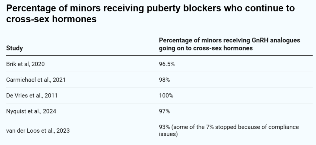 However, we now know that the situation for GAMT is quite different, despite some gender clinicians’ claims that patients can come off puberty blockers at any time and go through normal puberty in accordance with their natal sex. Far from being “fully reversible” as initially claimed, the evidence suggests they are not even “mostly reversible”. Rather, patients almost always go on to receive cross-sex hormones as these studies indicate: